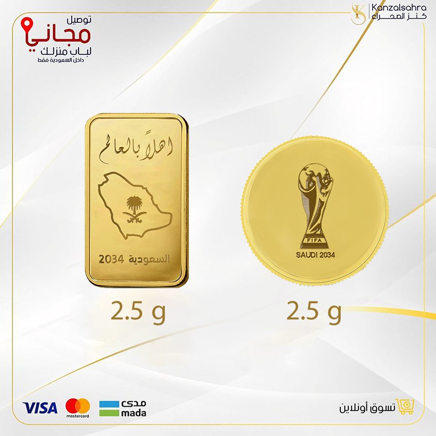 • سبيكة ذهب مستطيلة 2.5 غرام بنقش خريطة السعودية وشعار “أهلاً بالعالم”، احتفاءً باستضافة المملكة لكأس العالم 2034.