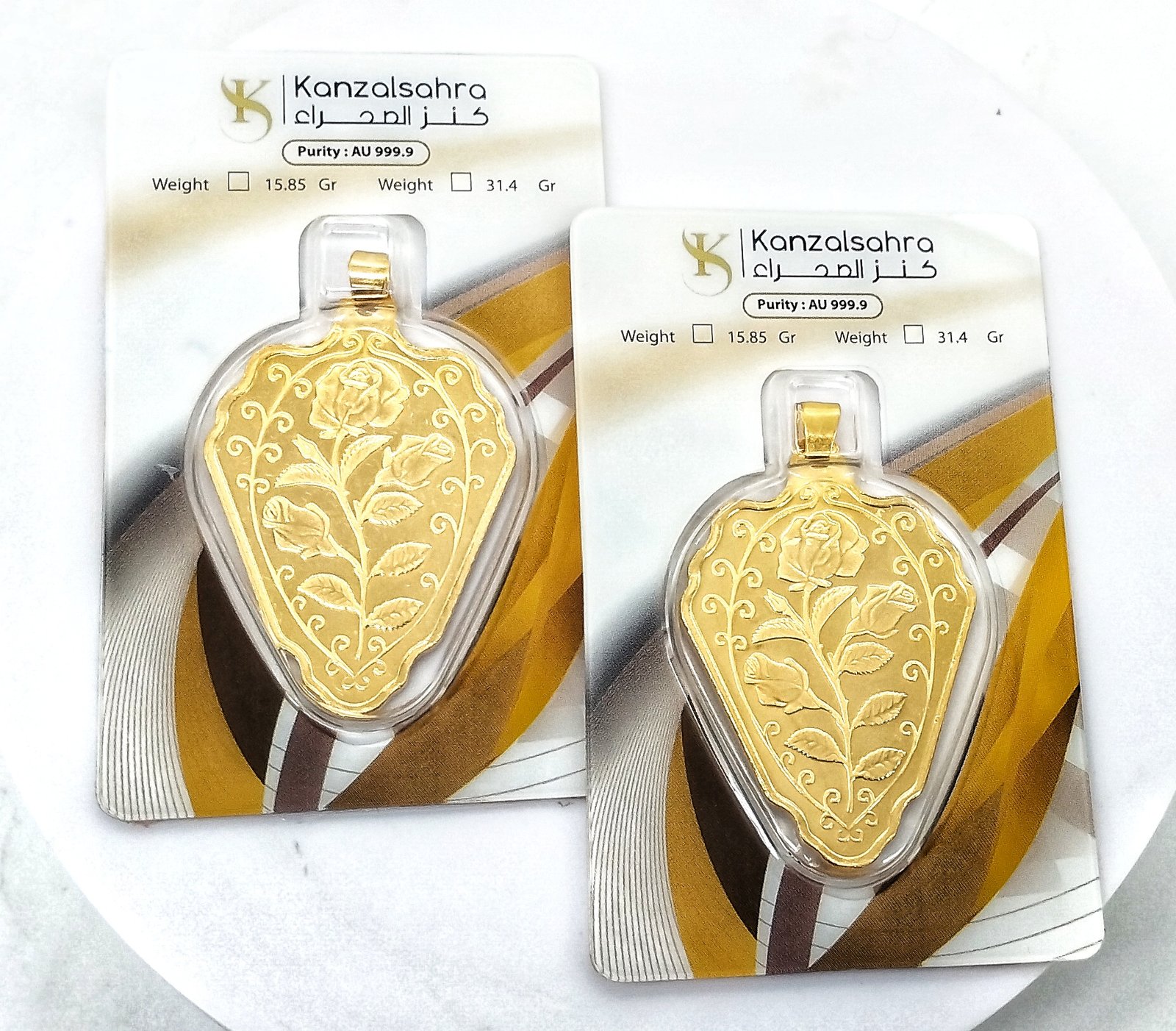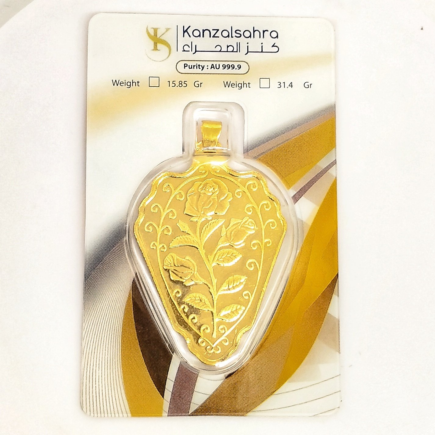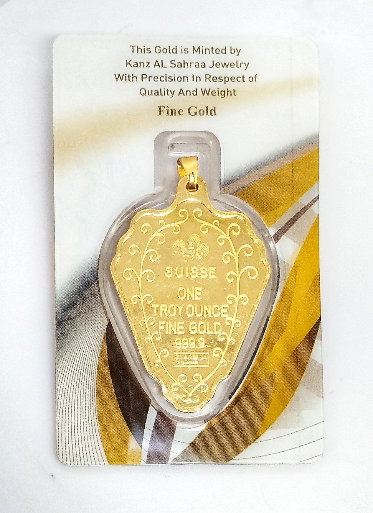 An ounce of gold bar 31.1 grams and a pendant (0.3) grams 24 karat. It is distinguished by an elegant and attractive design to be one of the most appropriate gifts that you can give to a sister, mother or even a friend, as it is ideal and suits various public and private occasions.